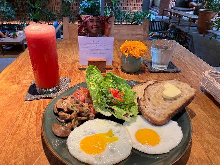 朝ごはんは、ローカルの皆さんが食べている紙につつまれたナシ・バビ・ケチャップを食べていたのでそんな空腹感はなかったのですが、カフェでブランチしようと思い立ちSariへ。もう店員さんも顔見知りな感じだな。