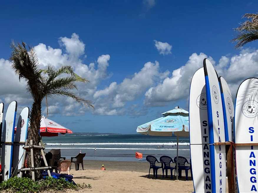 昼のクタビーチはこんな感じで、ビーチボーイズがサーフィンレッスン・ボードレンタル・デッキチェアやパラソルのレンタル、飲み物販売なんかをそこらじゅうでやってます。ボード借りたレンタルのところでにはインチキくさい指輪を売ってるトニーという物売りがやってきて、後で見てねとか言ってたな。いかにもインチキくさくて笑える。