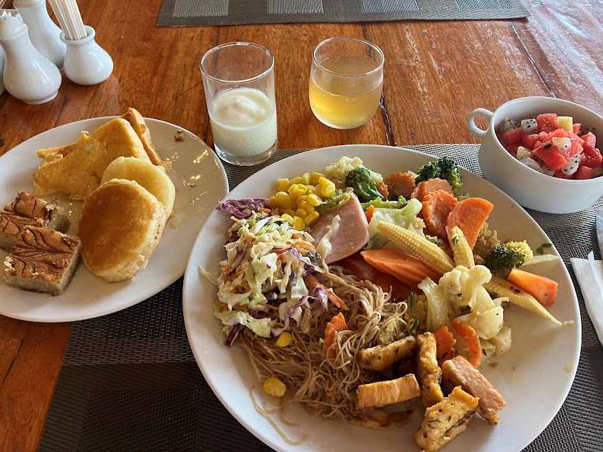 今日も雨が降りそうな空模様ですが、まずはホテルで朝食。ブッフェなので食べすぎます。サラダ・ハム・ソーセージ・チャーハン・麺・フレンチトースト・パンケーキ・クロワッサン。見たもの全部食べちゃうから大変満腹になります。