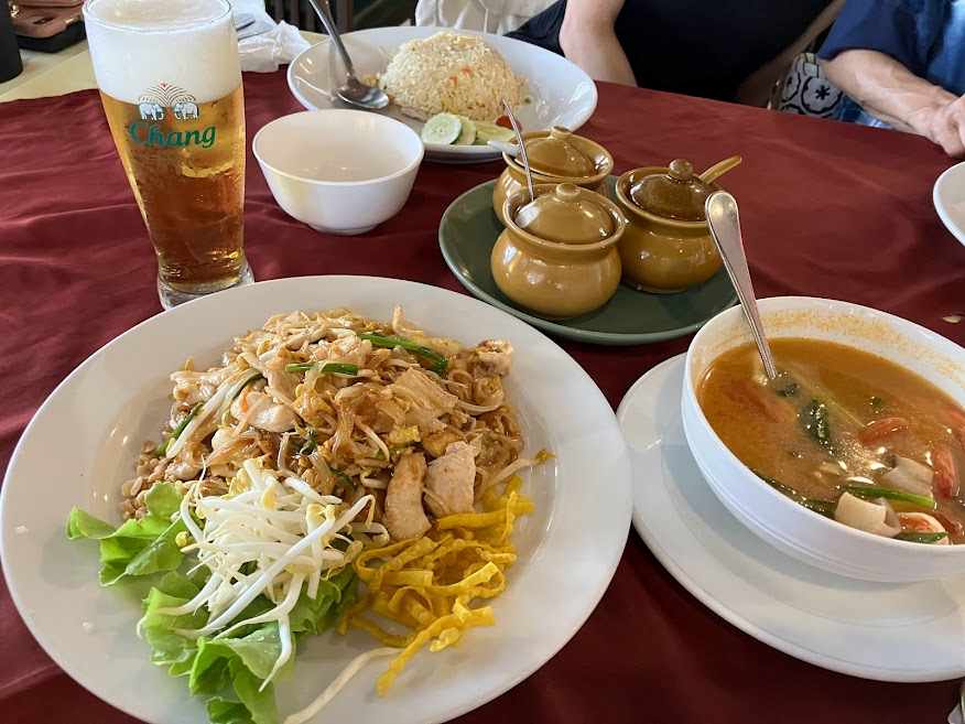 ちょっとぶらぶら散歩した後に食事です。フライドライス・パッタイチキン・パッタイシーフード・トムヤムクン、そしてビール。ビール美味いなぁ。大瓶2本飲むとお腹チャプチャプだなぁ。