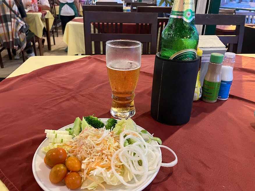雨がちょっと小やみになったのでビアタイム。道沿いのレストランでラージチャンを。Changは庶民の味のイメージです。