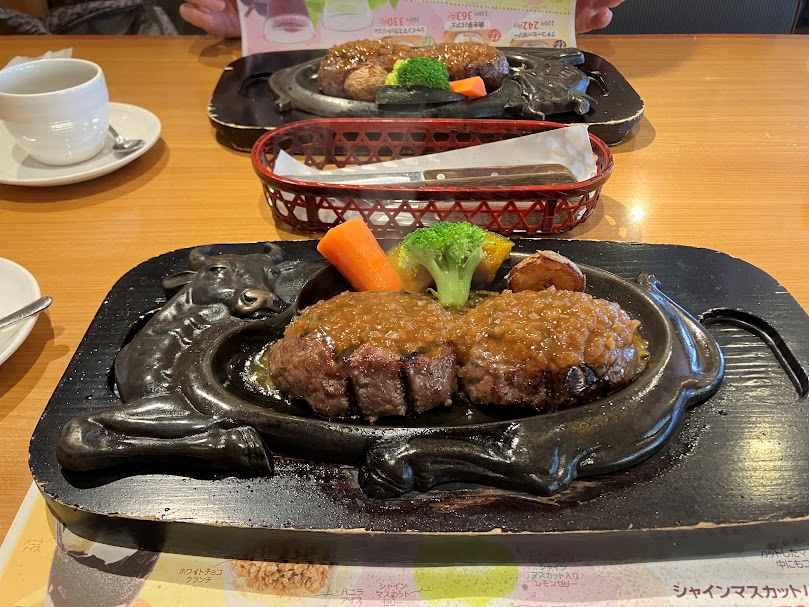 ランチコーヒーは150円で、ホットコーヒーはお代わり自由なので、これを頼む。コーヒーを飲みながら待っていると、来ました、来ました。いつもながら美味しそうな肉汁たっぷりのミディアムに焼き上げたげんこつハンバーグ。