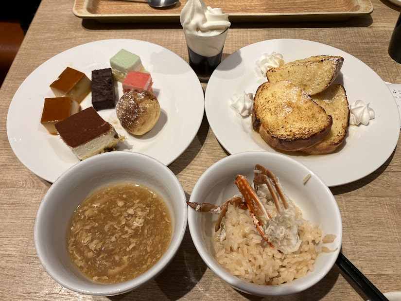 3ラウンド目で、酸辣湯とカニおこわ、フレンチトースト、デザートを頂きます。ここで、ほぼ満腹に。