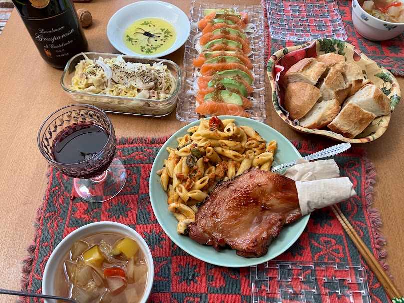 今年は、夫婦二人で自宅クリスマスです。昼過ぎから晩餐は始まり夕方まで。とっても美味しかったです。ありがとうございます。チキン・ペンネ・サラダ・フランスパン、甘い赤シャンペンがなんともクリスマスです。