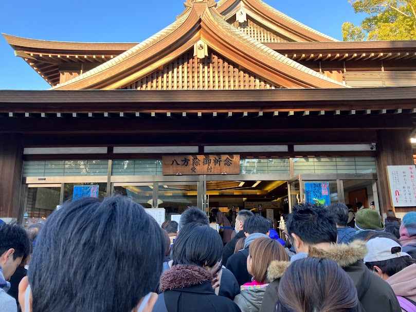 駐車して、いったん正面参拝口まで戻り、鳥居に頭を下げてから神社に入ります。祈祷申し込みは本殿に向かって右にあります。昨年はグルグル巻きでしたが、今年はL字待ちです。平日とは言えさすが相模の国一宮の寒川神社、申し込みするまで30分ほどかかりました。
